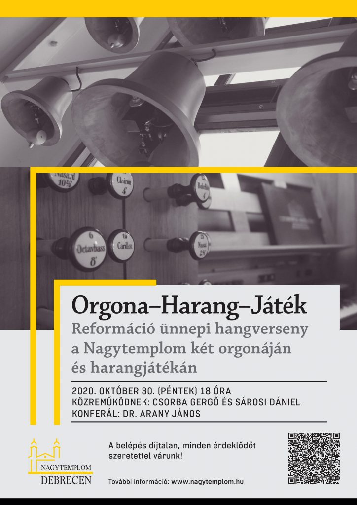 Október 30-án (pénteken) 18 órától az Orgona-Harang-Játék reformáció ünnepi hangversenyére a belépés díjtalan. A templomban az orrot és szájat eltakaró maszk viselése kötelező, valamint kizárólag a kijelölt padsorokban lehet helyet foglalni, így a szükséges védőtávolság biztonságosan megtartható a templomtérben. A koncertet élőben közvetítik a Debreceni Református Nagytemplom Facebook-oldalán, valamint a www.nagytemplom.hu weboldalon is.