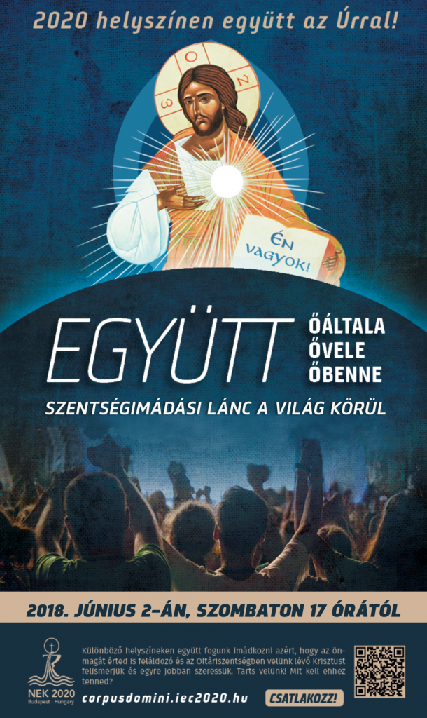 ?Jézus az Eucharisztia alapításakor felemeli a kenyeret és azt mondja: Vegyétek, ez az én testem! Meghív bennünket, hogy Ővele, és általa egymással is közösségben legyünk.? Az 52. Nemzetközi Eukarisztikus Kongresszus előkészítő bizottsága 2018. június 2-án, szombaton 17 órától szentségimádást hirdet. Az imaláncba bekapcsolódnak a nagyváradi egyházmegye és a debrecen-nyíregyházi egyházmegye plébániái is. A szervezők célja, hogy egyazon időben, 2020 helyszínen imádják a velünk lévő Krisztust.