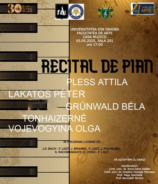 A Debreceni Egyetem Zeneművészeti Karának oktatói adnak koncertet május 5-én, hétfőn 17 órától a Nagyváradi Egyetem Művészeti Karának új épületében, a Zene Háza második emeletén található 201-es teremben.