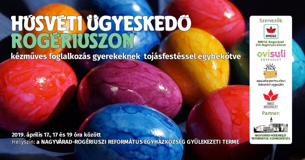 Húsvét közeledtével beszeretnénk vonni a gyerekeket az ünnepi készülődésbe. Éppen ezért a nagyváradi RMDSZ dél-rogériuszi körzete közösen az Ovisuli Egyesülettel, a Diákokért Egyesülettel és a nagyváradi RMDSZ Nőszervezettel, partnerségben a Nagyvárad-Rogériuszi Református Egyházközséggel húsvéti kézműveskedésre hívjuk a gyerekeket, szülőket, nagyszülőket. Április 17-én, szerdán délután 17 órától az egyházközég gyülekezeti termében Perecz Simó Annamária, Vass Anna, Herlitska Ibolya és Koncz Ágota tanítónénik tartják a foglalkozást. A kézműveskedés során felhasználjuk a tavasz, illetve a húsvét általunk kedvelt motívumait, a különböző korosztályoknak szóló megfelelő foglalatosságokon keresztül. A húsvéti kézműveskedés gyerekekkel kellemes családi program is egyben.
