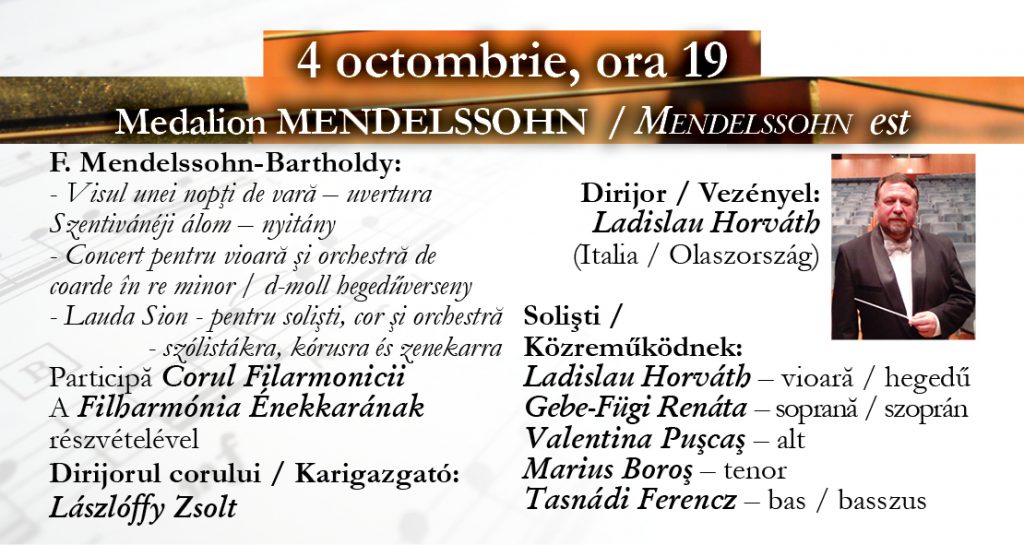 Következő koncertünkre három, Felix Mendelssohn-Bartholdy által komponált, nagy szépségű művet ajánlunk közönségünknek. Elsőként a Szentivánéji álom nyitányt hallgathatják meg. A nyitányt Mendelssohn tizenhét éves korában írta; Shakespeare vígjátékának teljes kísérőzenéjét másfél évtizeddel később komponálta hozzá, s ezt 1843-ban mutatták be. Ezt követăen a d-moll hegedűverseny fog felcsendülni. A ?csodagyermek Mendelssohn? tehetségének igazolására nem is kell jobb példa, mint a tizenhárom évesen, 1822-ben írt hegedűverseny, melyet tanárának, Eduard Rietznek (1767-1828) ajánlott. A mű kézirata 130 évig lappangott. Végül is 1951-ben Yehudi Menuhin (1916-1999) bukkant rá az eredeti kottára egy müncheni antikváriusnál, és tette világszerte ismertté az alkotást, és ő volt az újkori bemutató előadója is. Hangversenyünket az 1846-ben keletkezett Lauda Sion – szólistákra, kórusra és zenekarra, op. 73 kantátával zárjuk. A művet a zeneszerző a Li?ge-i St. Martin Bazilika rendelésére komponálta.