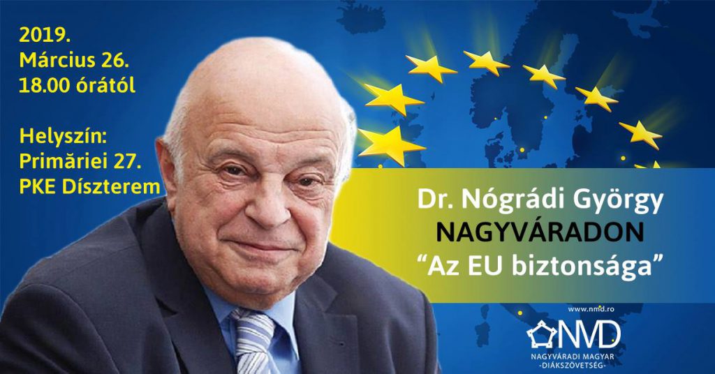 Ismét Nagyváradra érkezik Nógrádi György biztonságpolitikai szakértő, közgazdász, egyetemi tanár, aki a Nagyváradi Magyar Diákszövetség (NMD) meghívására ?Az Európai Unió biztonsága? címmel tart előadást március 26-án, kedden, 18 órától, a Partiumi Keresztény Egyetem dísztermében (Primăriei/Teleki utca 27 szám).