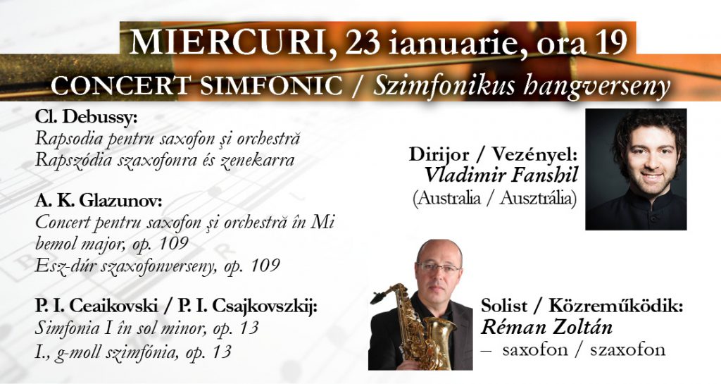 Koncertünk műsorszerkezete ezúttal nem követi a hagyományokat, hiszen két szaxofonra és zenekarra írt művet és egy különleges szépségű szimfóniát ajánlunk a kedves hallgatók figyelmébe. Koncertünk első részében Claude Debussy (1862?1918) Rapszódiája szaxofonra és zenekarra (K.467) hangzik el. A mű 1910-ben keletkezett Bécsben, és Elie Hall szaxofon művésznőnek ajánlotta. Ezt követően Alexandr Glazunov (1865?1936) Esz-dúr szaxofonversenyét (op. 109) hallhatja a nagyérdemű. A sokoldalú orosz romantikus mester csillogó eleganciájú versenyműveiről ismert. Az Esz-dúr szaxofonverseny 1934-ben keletkezett a német szaxofonművész, Sigurd Rascher kérésére. Koncertünk második felében Pjotr Iljics Csajkovszkij (1840?1893) egyik kevésbé ismert remekművét hallhatja a közönség, rendhagyó módon nem a sokat játszott utolsó három szimfónia egyikét, hanem a Téli álmodozás alcímet viselő I. szimfóniát.