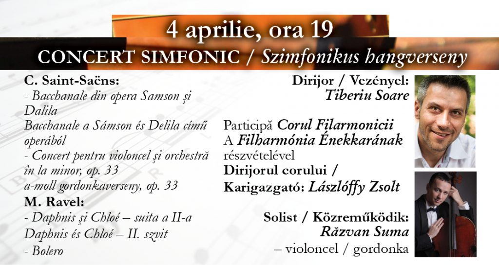 Következő koncertünkre négy nagy szépségű művet ajánlunk a nagyérdemű figyelmébe. Az első részben Camille Saint-Saëns (1835?1921) egy népszerű balettrészletét, a Sámson és Delila című operából az ún. Bacchanalet és az a-moll gordonkaversenyét, op. 33 hallhatja a nagyérdemű. A sokoldalú francia romantikus mester ismert csillogó eleganciájú versenyműveiről. A csellóirodalmat két koncertáló művel is gazdagította, az elsőt, a népszerűbb a-moll gordonkaversenyt 37 esztendősen, 1872-ben komponálta. Koncertünk második részében Maurice Ravel (1875?1937) két különleges alkotását, Daphnis és Chloé ? II. szvitjét és a Bolerot ajánljuk a hallgatóság figyelmébe. A francia zene minden jellegzetes vonása fellelhető Ravel életművében: kultúra, szellem, sokoldalú érdeklődés, humor és kiváló formaérzék. Ravelt ugyanakkor, zenekari palettájának árnyalt színgazdagsága és invenciója által a modern hangszerelés egyik legjelentősebb mestereként tartjuk számon.