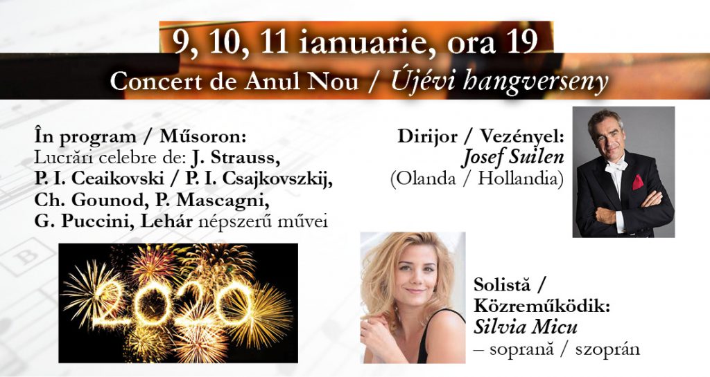 Három azonos műsorú Újévi hangversenyünk csütörtökön, pénteken, illetve szombaton kerül megrendezésre a Filharmónia termében. Ezúttal is színes és változatos műsort nyújtunk közönségünknek, hogy már most, az év elején örömteli perceket szerezhessünk. Műsorunkban Johann Strauss néhány igen népszerű alkotása mellett (Egy éj Velencében nyitány, Tik-Tak polka, Egyiptomi induló, Menydörgés és villámlás polka, A denevér nyitány; A denevér – ?Spiel ich die Unschuld vom Lande?, Pizzicato polka, A vadászaton polka és Kék Duna keringő), melyek az elmúlt évtizedekben immár hagyományossá váltak, számos más népszerű zeneszerző remekműveiből is válogattunk, mint Lehár Ferenc (Giuditta – ?Meine lippen sie küssen so heiss?), Pjotr Iljics Csajkovszkij (Csipkerózsika keringő), Charles Gounod (Romeo et Juliette – ?Je veux vivre?), Pietro Mascagni (Intermezzo a Parasztbecsületből), Giacomo Puccini (Bohémélet – Quando m’en vo soletta per la via).