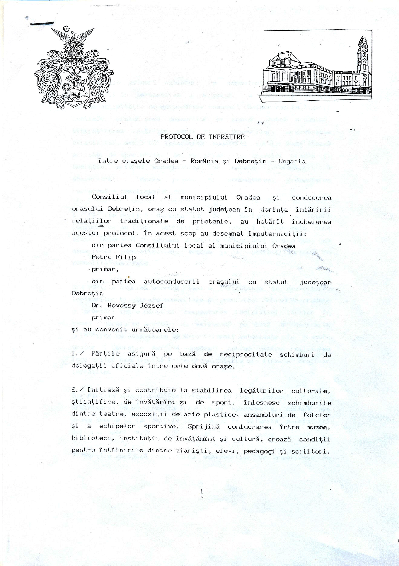 Debrecen és Nagyvárad 1992. szeptember 30-án írta alá a Testvérvárosi szerződést.