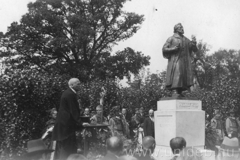 1934. május 17-én leplezték le a Főépület előtt lévő Tisza István téren (ma Egyetem tér) az első, Méliusz Juhász Péter (1536-1571) emlékére felállított szobrot. Az alkotás a magyar református egyház szervezőjét, a hitvitázót ábrázolja, amint könyvvel a kezében szenvedélyesen szónokol.