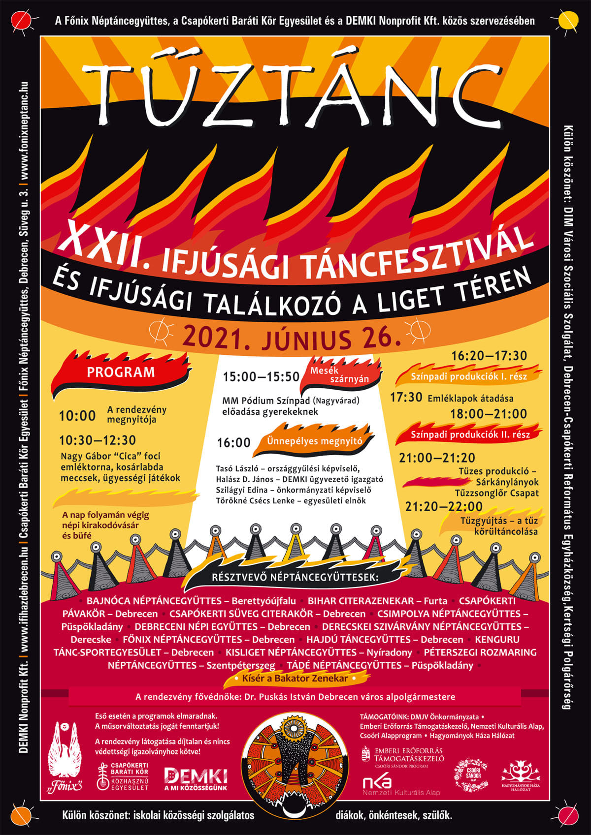 Tizenöt néptáncegyüttes 289 táncosának részvételével, új helyszínen rendezik meg június 26-án a 22. Tűztánc ifjúsági táncfesztivált és találkozót Debrecenben.