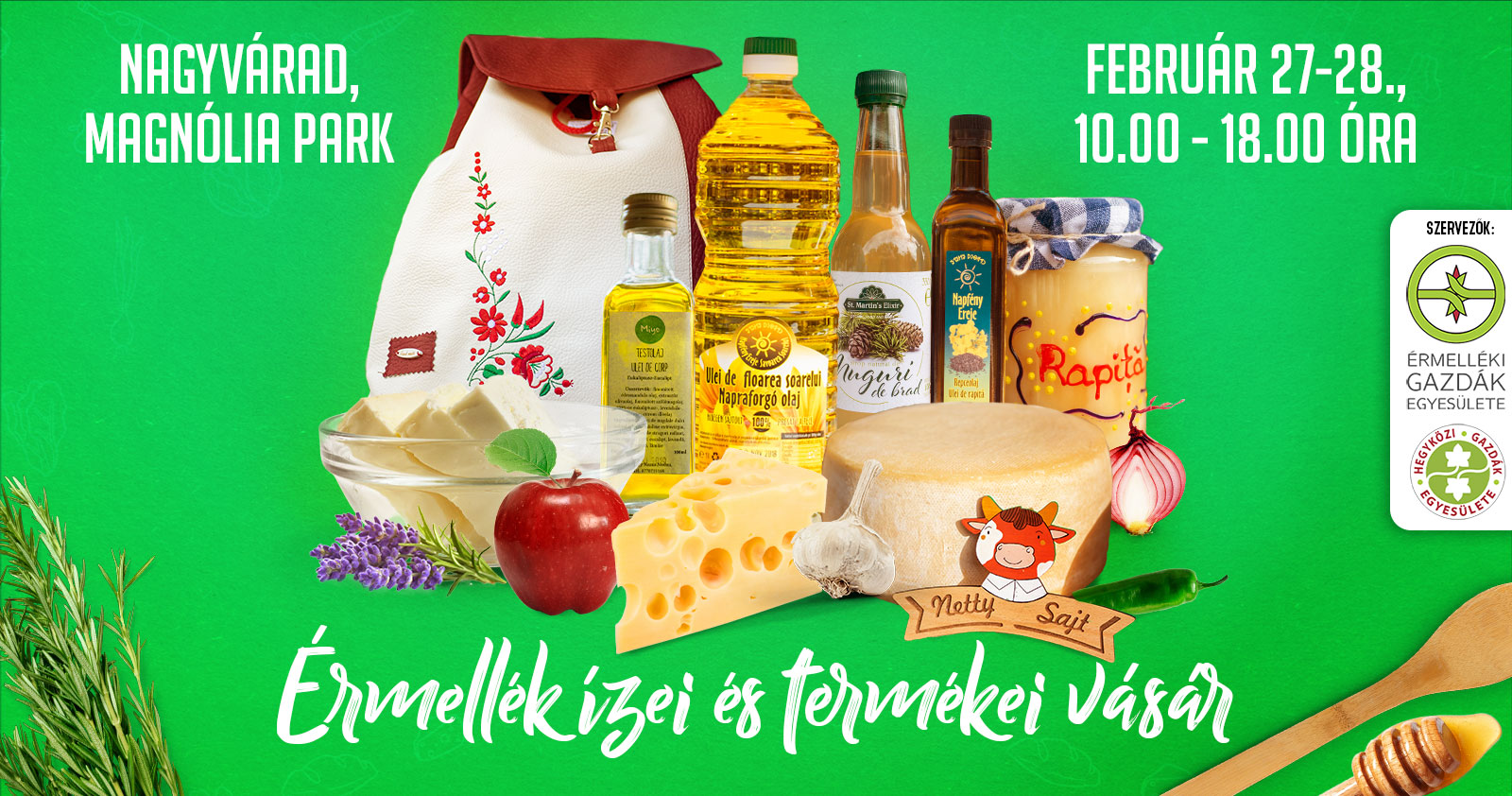 Február 27-én és 28-án az Érmelléki Gazdák Egyesülete (ÉGE) ismét megszervezi az Érmellék Ízei és Termékei nevet viselő kirakodó vásárt, amelynek ezúttal is a házi termékek adják hagyományos jellegét. A február végi termékfelhozatalra a nagyváradi Magnólia parkban (Rogériusz negyed) kerül sor, szombaton és vasárnap 10?18 óra között.