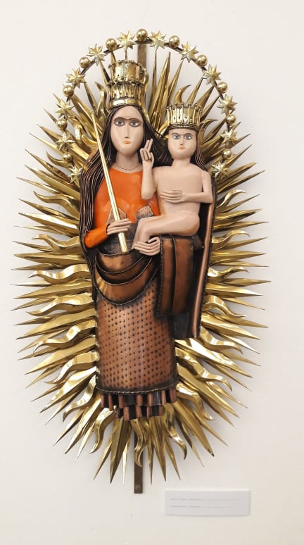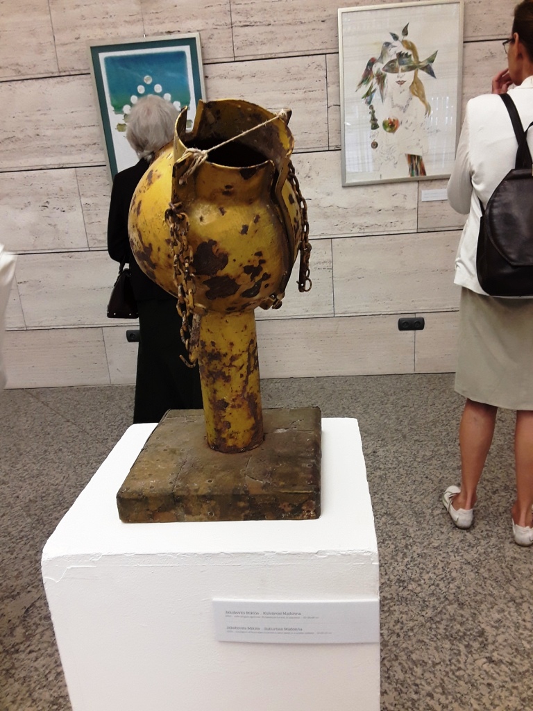 A kiállított alkotások között van a nagyváradi Jakobovits Miklós Külvárosi Madonna című alkotása is (talált tárgyak együttese, fémlemezzel burkolt, fa alapzaton 52×26×26 cm). Jakobovits Miklós az utóbbi években egyre inkább az egyszerű anyagok, szinte banális tárgyak újraértelmezése felé fordult, azzal a szándékkal, hogy azoknak egy megszenteltebb, felemeltebb, metafizikus jelentést adjon. Ezeket beleépítette a munkájába, festői eszközökkel, térbeli komponálással. A mindennapi tárgyaknak ezen keresztül adott különleges jelentést. Így keletkeztek az utolsó éveiben alkotott ún. bádog képei, ahol a rozsdás, talált bádogokból szerkesztett különleges felszentelt látványt. Fotó: denagy.hu[/caption]