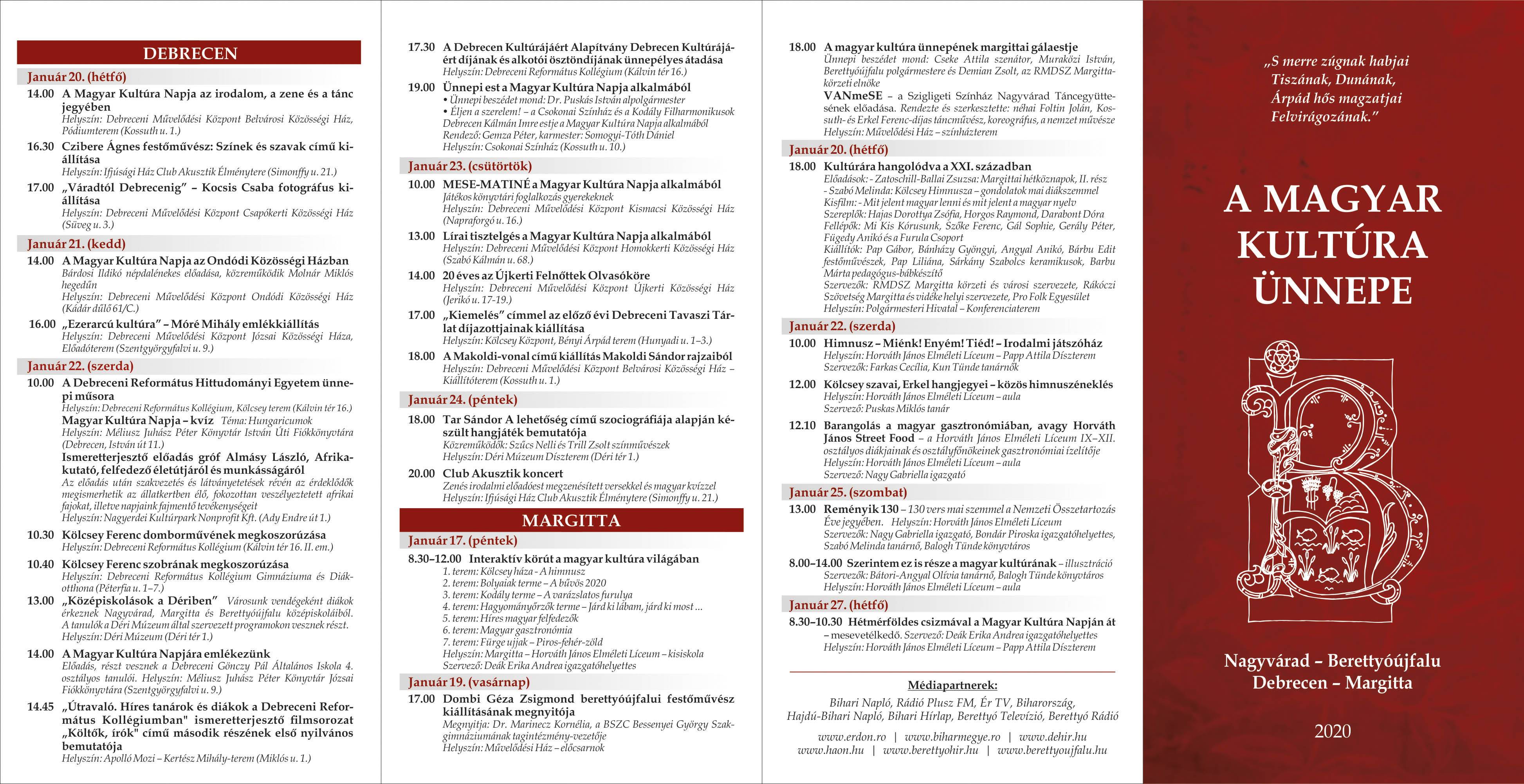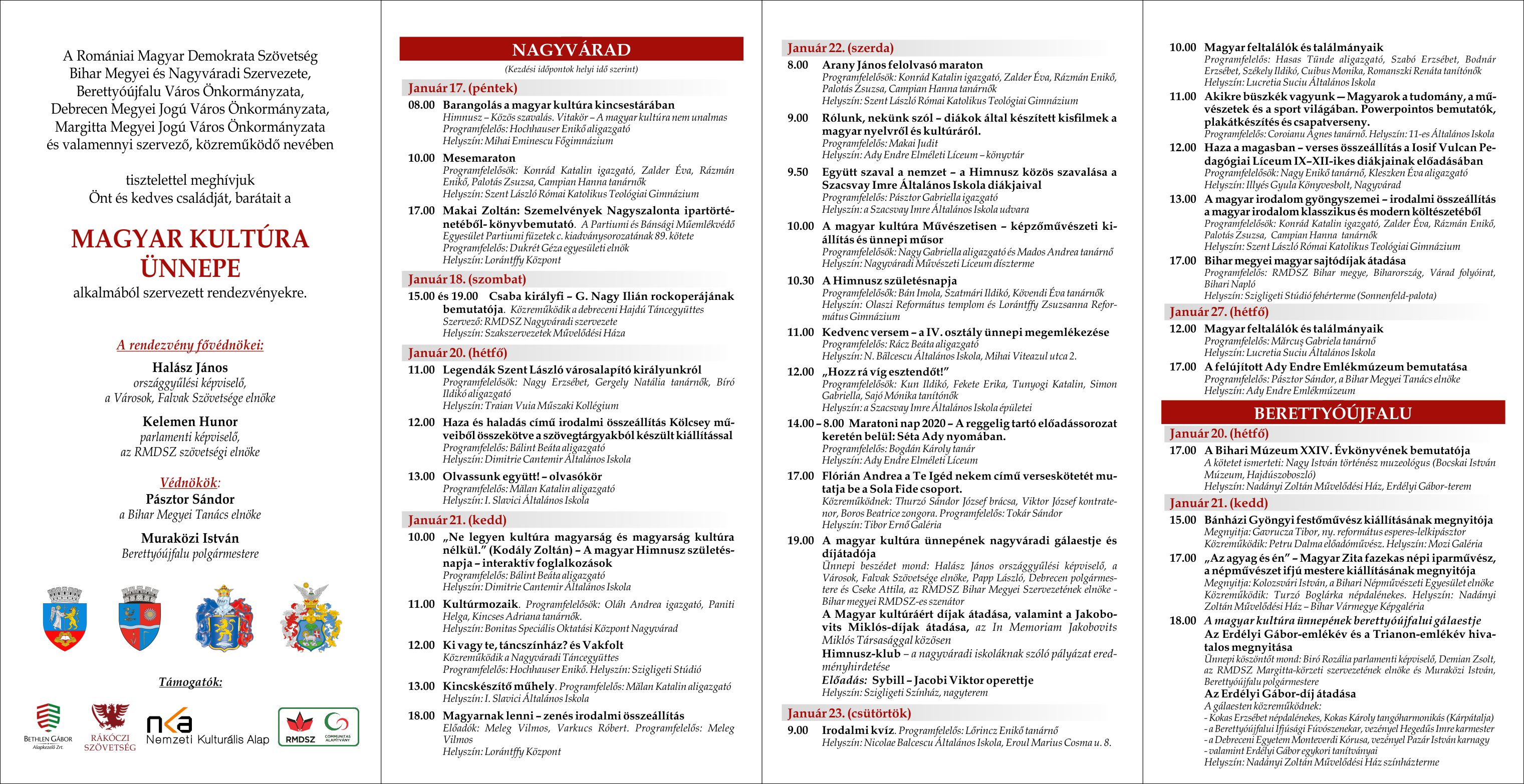 Debrecen önkormányzata ebben az esztendőben is együtt ünnepli a magyar kultúra napját a Romániai Magyar Demokrata Szövetség Bihar Megyei és Nagyváradi Szervezetével, Berettyóújfalu Város Önkormányzatával, valamint Margitta Megyei Jogú Város Önkormányzatával.