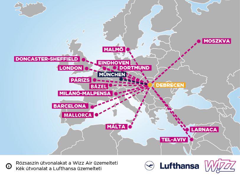 ?A Debrecen Airport utasforgalma 2018. júniusában és az év első felében is stabilan fejlődött. Közép-Kelet Európa legnagyobb légitársasága, a Wizz Air a debreceni bázis gépével már március vége óta több frekvenciával közlekedik és a gép kapacitása a nyári szünet kezdete óta a maximumon üzemel, Londonba már heti 10, Eindhovenbe pedig heti 3 járattal ill. a többi úti célokra heti 2 frekvenciával. Európa egyetlen 5-csillagos légitársasága a Lufthansapedig hetente 5-ször repül március vége óta Debrecenből Münchenbe. Így idén már 8 városba,London, Párizs, München, Milánó, Moszkva, Eindhoven, Malmö mellett Tel Avivba is van közvetlen menetrend szerinti járata Debrecennek és a kelet-magyarországi régiónak.