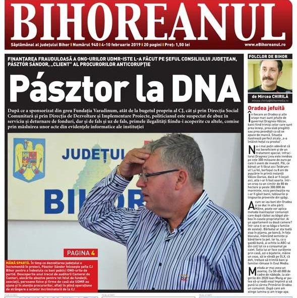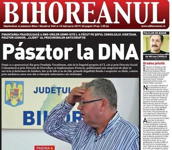 Bihar megye legolvasottabb lapja, a Bihoreanul, Pásztor a Korrupcióellenes Ügyészségen címmel, elsőoldalas vezető anyaggal jelent meg a héten. A cikk beharangozójában arról tájékoztat, hogy Pásztor Sándor, a Bihar Megyei Tanács elnöke hivatali hatalommal való visszaélés, hűtlen kezelés, csalás és okirat-hamisítás gyanújával a Korrupcióellenes Ügyészség célkeresztjébe került. A hetilapban közöltekre reagálva, a Bihar megyei RMDSZ sajtóirodája közleményt adott ki, amelyben magyarellenességgel vádolja a lapot, és leszögezi, hogy az ügyészség senkit sem vádolt meg, miközben tendenciózusan vizsgálódik és kiszivárogtat.
