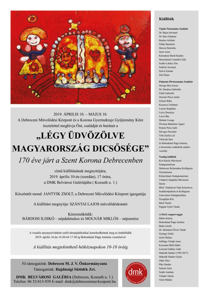 A jeles alkalom különleges tárlat megvalósítására sarkallta a Bobonkáné Papp Antónia által létrehívott debreceni Korona Gyermekrajz Gyűjtemény Körét. Együttműködve a Debreceni Művelődési Központtal egy olyan kiállításra vállalkoznak, mely több oldalról igyekszik megmutatni a magyarság szent ereklyéjét: bemutatja tárgyi valóságában Szelényi Károly egyedülálló fotói segítségével, illetve bemutatja népművészeti alkotásokon, a Bobonkáné Papp Antónia tanítványai által készített gyermekrajzokon, tűzzománcokon és kortárs műalkotásokon keresztül, hogy mit jelentett, ill. jelent ma a magyarság, ill. a debreceniek számára a Szent Korona.