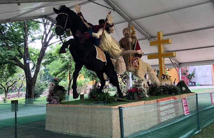 Források szerint 1095-ben Szent László testét Somogyvárról Debrecenen keresztül vitték végső nyughelyére, az általa alapított váradi Szűz Mária-székesegyházba. Azonosulva a magyar kormány 1735_2018_ XII.18. számú határozatában megfogalmazott szándékával. A több mint 900 éves esemény előtt tiszteleg az a sok ezer virágszállal díszített kompozíció, amely az ereklyével együtt a zarándokútról hazatérve az idén 50. Debreceni Virágkarneválon is képviseli majd Szent László szellemiségét.Debrecen városa, a Debreceni Egyetem,valamint a Görögkatolikus Metropólia, a Debrecen-Nyíregyházi Római Katolikus Egyházmegye és a Tiszántúli Református Egyházkerület összefogásával és a Sapientia Erdélyi Magyar Tudományegyetem támogatásával útjára indított virágkompozíciót Pikó Sándor debreceni képzőművész és alkotótársai alig egy hónap alatt készítették el. A szoborkompozíció a szerte Európában ismert Szent László-legendát mutatja be, amely számos templom oltárát vagy freskóját díszíti az egész Kárpát-medencében. A Szent László és a kun vitéz csatája - egy értelmezés szerint - az apostol király hősies küzdelmére utal a keresztény Európa védelmében, - más olvasat alapján - egy ősi mítoszt, az emberi lélek saját küzdelmét, a sötétség és a világosság harcát személyesíti meg.