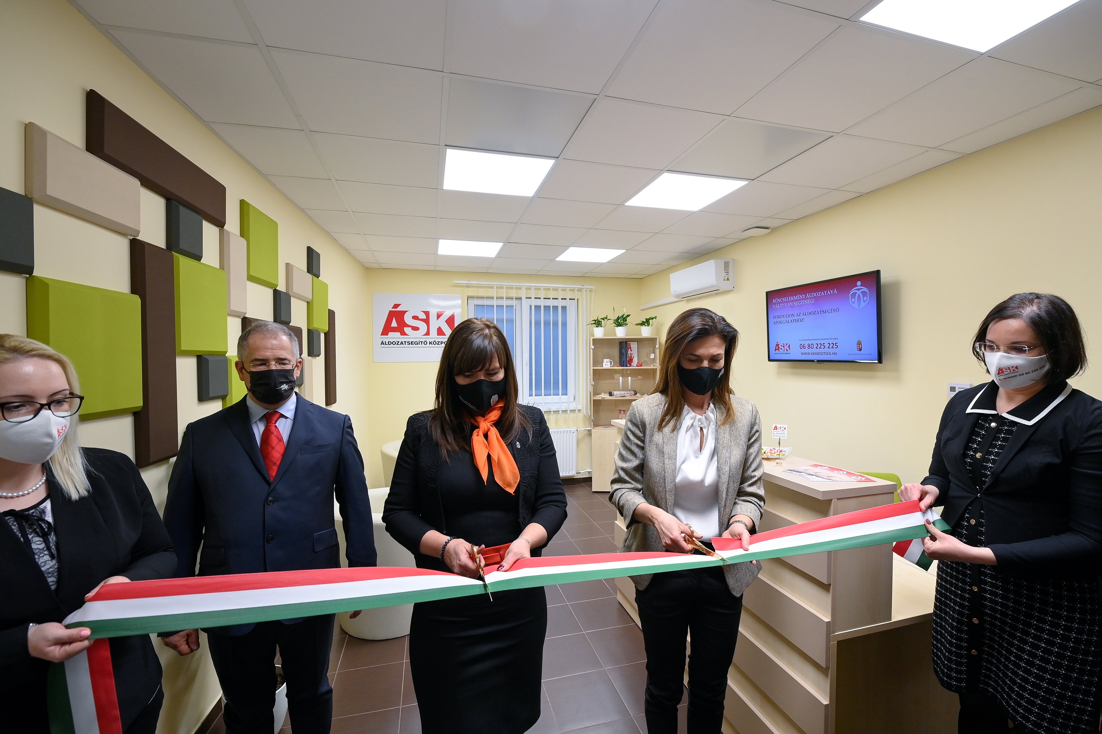 Fotó: Varga Judit igazságügyi miniszter (j2) és Szeiler Orsolya, az Igazságügyi Minisztérium igazságügyi közszolgáltatásokért felelős helyettes államtitkára (k) átadja az áldozatsegítő központot Debrecenben 2022. február 15-én. Mellettük balról Kósa Lajos, a térség fideszes országgyűlési képviselője. MTI/Czeglédi Zsolt