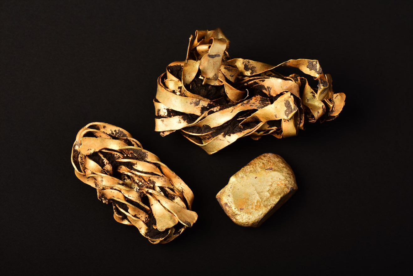Rendkívüli felfedezést tettek június végén egy építkezést megelőző feltáráson a Déri Múzeum régészei. Munkájuk nyomán késő bronzkori, valamikor Kr. e. 1200?900 között elrejtett aranykincs került napvilágra. A műszeres felderítés segítségével felszínre hozott, majdnem 10 dekagrammot nyomó értékes leletegyüttes három részből áll. Egy kisméretű, téglatest alakú aranytömb (öntecs) mellett két keskeny, megtekert aranyszalagokból összehajtogatott ?gombolyag? alkotja az első, Debrecen belvárosában feltárt aranykincset. A lelet feltehetően egy bronzkori aranyműves mester nyersanyagkészlete lehetett, melyet talán egy bőr- vagy textilerszényben(?) rejthettek el, számunkra ma már ismeretlen okokból.