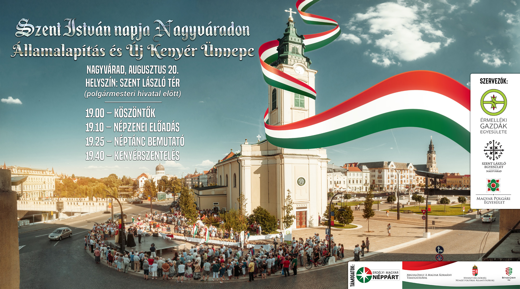 Bár a koronavírus járvány mindannyiunk életére rányomta bélyegét, és ez ünnepeink megtartását is befolyásolta, idén ismét a megszokott helyszínen adhatunk hálát mindennapi kenyerünkért, és hajthatunk fejet őseink államalapító és megtartó bölcsessége előtt. Az eseményt szervező Érmelléki Gazdák Egyesülete, a Magyar Polgári Egyesület és a Szent László Egyesület mindenkit szeretettel hív és vár augusztus huszadikán este 19.00 órára a nagyváradi városháza épülete előtti térre. A program szerint a köszöntőbeszédeket népzenei előadás majd néptánc bemutató követi, végül pedig a hagyományokhoz híven az ünnepélyes kenyérszentelésre kerül sor, mely a Magyarok Kenyere program Bihar megyei záróeseménye is egyben. A szervezők minden résztvevőnek juttatnak a megszentelt kenyérből.