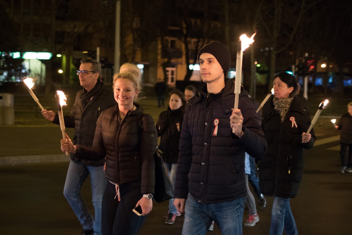 ?Körülötted miljom s miljom fáklya / Meggyúlt szíveink lobogó lángja? mottóval indult Debrecenben immár hagyományos fáklyás felvonulás az Egyetem tér ? Egyetem sugárút ? Bethlen utca ? Déri tér útvonalon az 1848-as forradalom évfordulójának előestéjén, 2019. március 14-én.