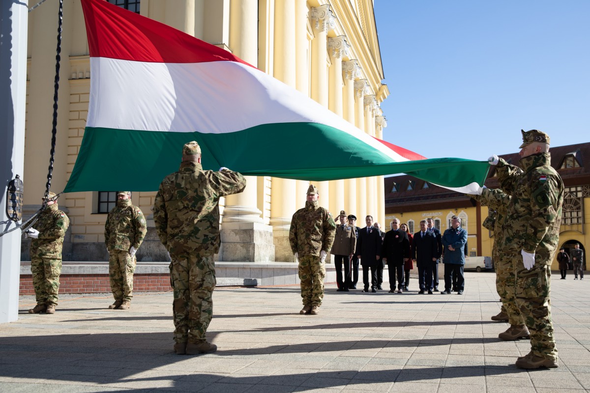 Az 1848-as forradalom 172. évfordulója alkalmából a Himnusz hangjai mellett vonták fel a nemzeti lobogót Debrecen főterén március 15-én kora délelőtt.