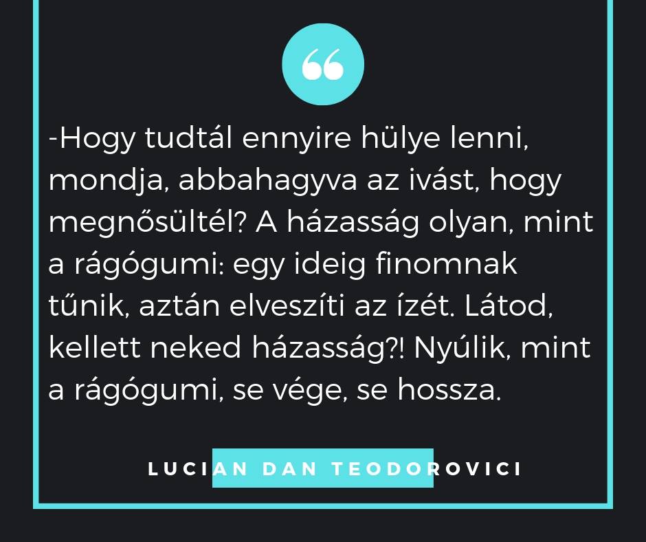 Az irodalmi happeningen Lucian Dan Teodorovici Rágógumi (Ford.: Szonda Szabolcs) című novelláját Mészáros Tibor és Wessely Zsófia olvassa fel a Grand Hotel Aranybikában. Lucian Dan Teodorovici novellájában rögtön a pokolban találjuk magunkat, ám hősünk elkárhozása csak ezután kezdődik. A stációkat mintha egy szürkehályoggal megvert kancsal műkedvelő festette volna a szürke tizenhat árnyalatával, a kontúrok mégis élesek, a perspektíva mesteri. Egy kietlen jelenben sötét, közönyös lelkünk szállingózik a sivár jövőbe. A mindannyiunk számára jól ismert, sőt már otthonos pokolról tudjuk, hogy benne a zuhanás örök. Ez a novella egy emlékeztető csupán.