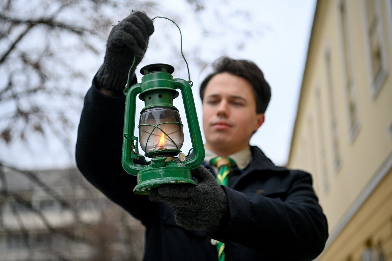 Fotó: A betlehemi Születés templomának örökmécseséről származó lánggal meggyújtott petróleumlámpát tart egy cserkész Debrecenben 2022. december 13-án. A lángot a 43. Főnix Cserkészcsapat tagjai vitték a városba. MTI/Czeglédi Zsolt