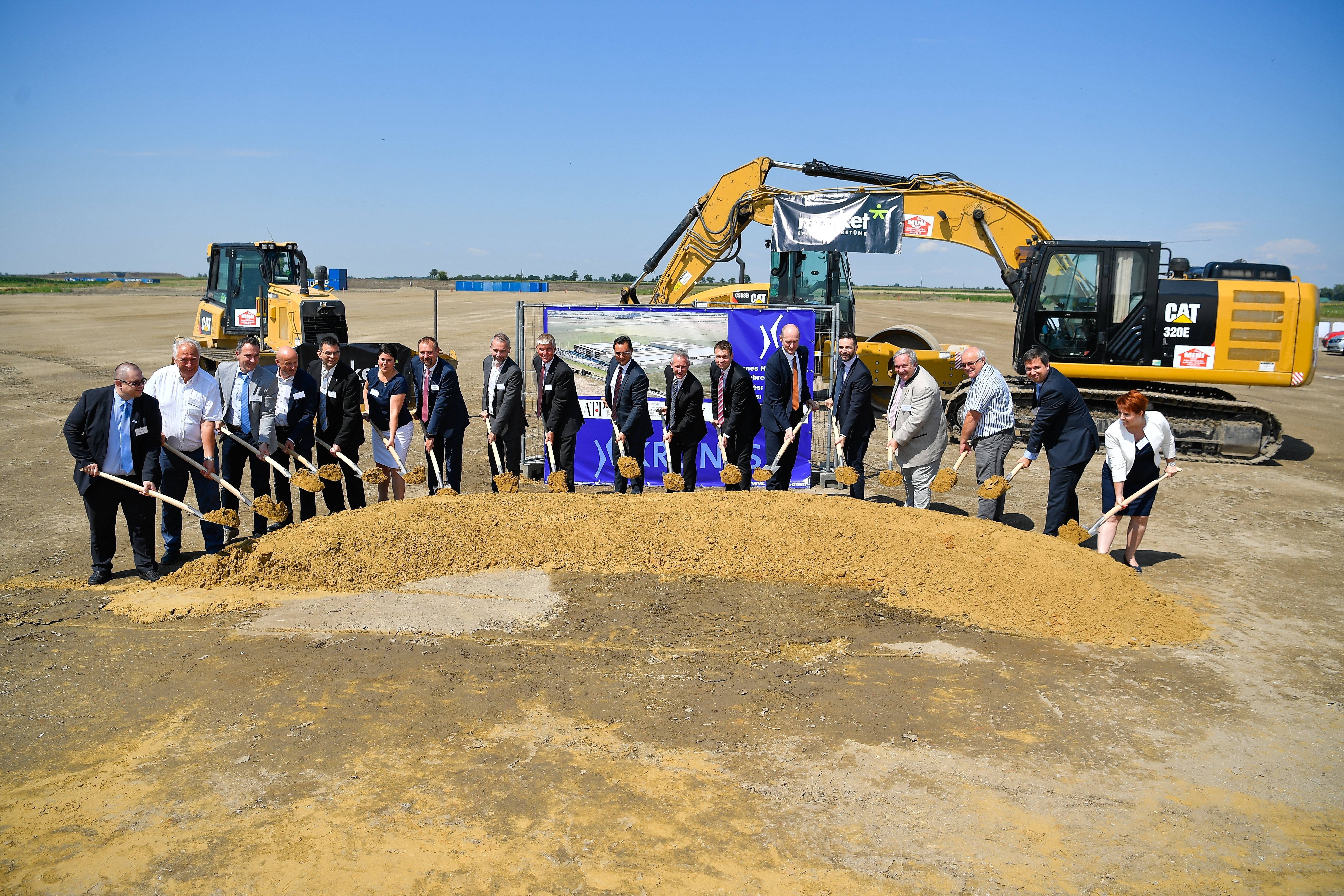 Kép: Papp László polgármester (j9), Pascal Männche, a Krones Hungary Kft. ügyvezetője (j8) és Menczer Tamás tájékoztatásért és Magyarország nemzetközi megjelenítéséért felelős államtitkár (j7) a Krones új debreceni gyára építésének jelképes megkezdésén, az "első kapavágáson" 2018. július 17-én. A csomagolás- és italtöltő technikával foglalkozó német Krones gépgyártó vállalat Debrecen déli ipari övezetében építi fel új gyárát. MTI Fotó: Czeglédi Zsolt