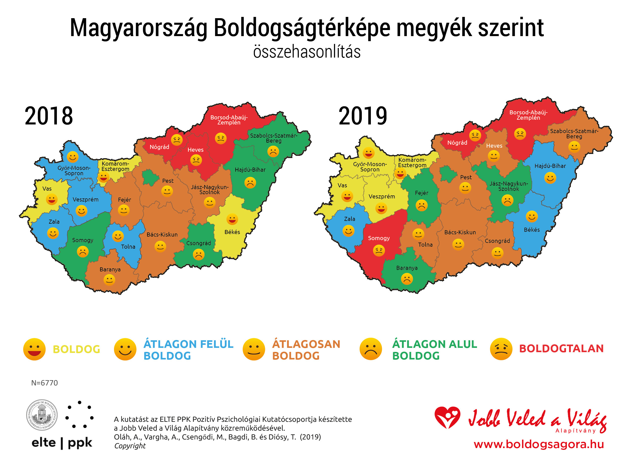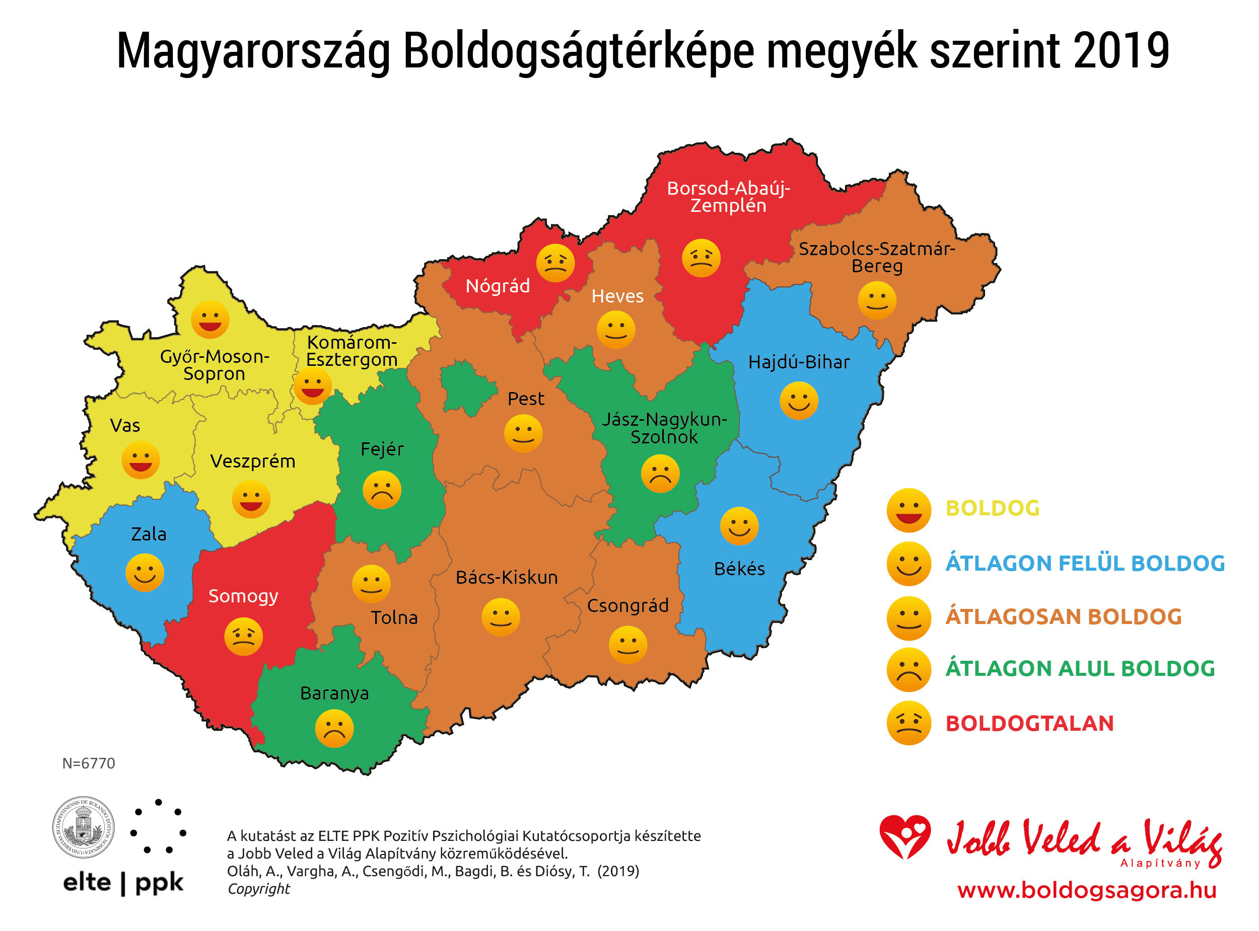 Az Eötvös Loránd Tudományegyetem Pedagógiai és Pszichológiai Kar (ELTE PPK) Pozitív Pszichológiai Kutatócsoportja Oláh Attila professszor irányításával, a Bagdi Bella vezette Jobb Veled a Világ Alapítvánnyal együttműködve végzett felmérést Magyarország 832 településén élő 17-89 éves férfiak és nők megkérdezésével. A kutatócsoport a boldogság világnapjára összegezte a 2019-es Boldogságtérkép Kutatás eredményeit.