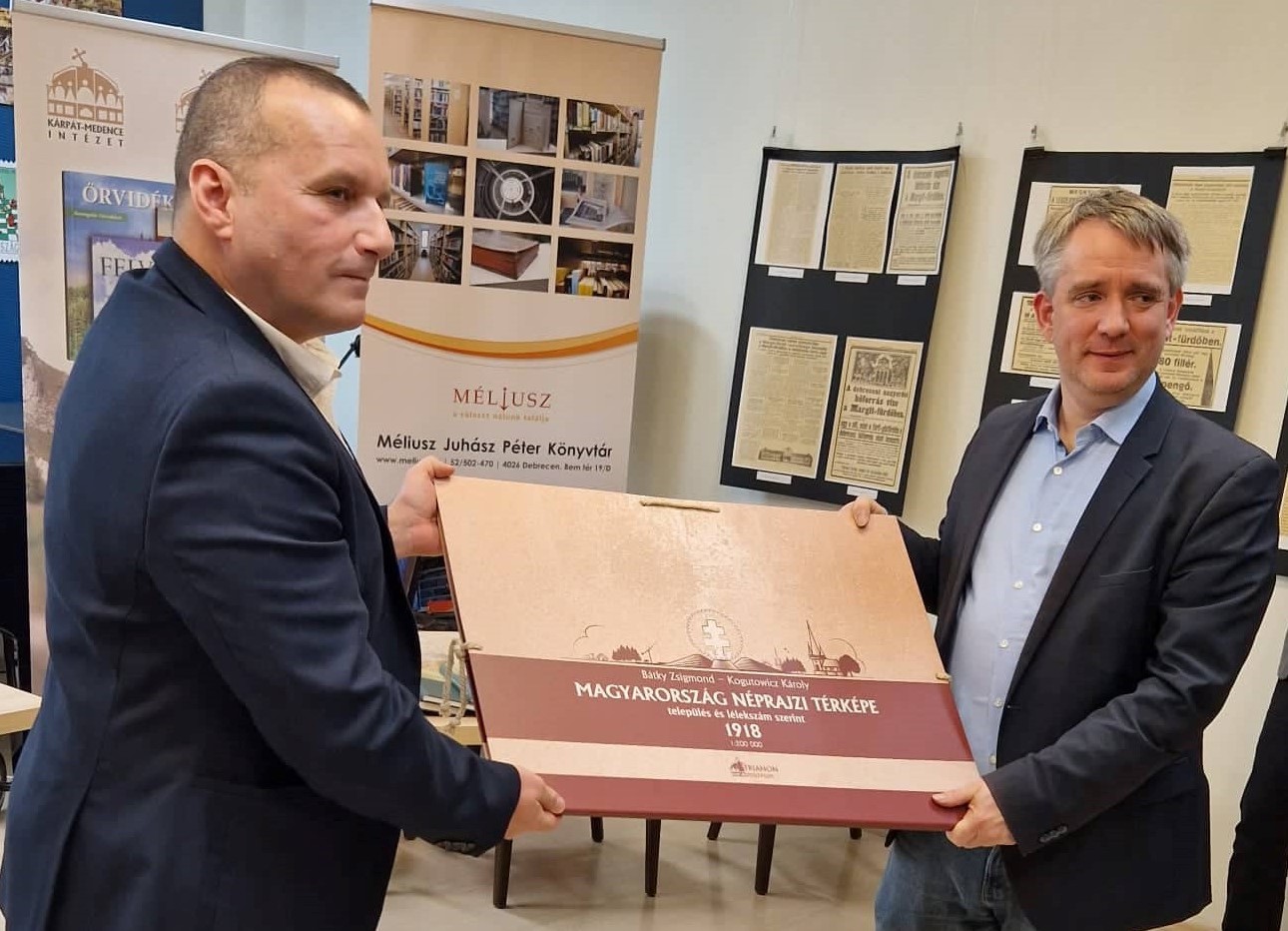 Kiemelt kép: Dr. Kovács Béla Lóránt, a debreceni Méliusz Juhász Péter Könyvtár igazgatója átveszi Dr. Szabó Pál Csabától, a Trianon Múzeum igazgatójától az egyik ajándékba kapott kiadványt.