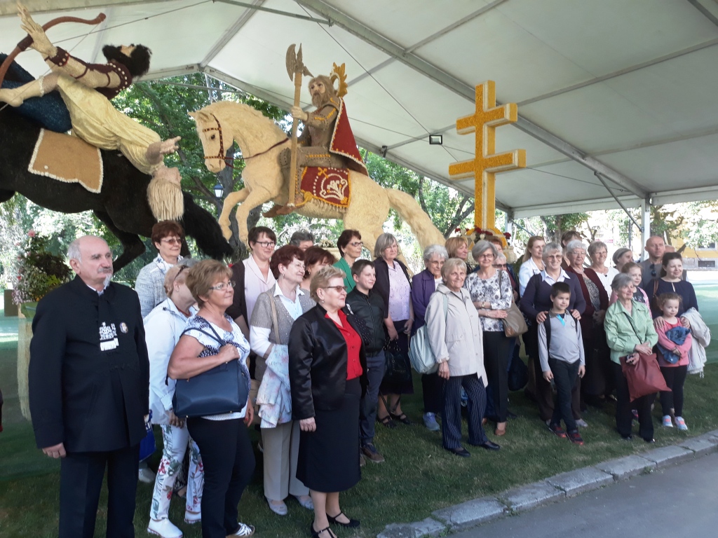 Az imádkozó, éneklő, lélekben az eseményre készülő hívekkel hamar Nagyváradra érkeztünk. Az ünnepi szentmise előtt még lehetőség nyílt arra, hogy a debreceni zarándokok is megtekintsék a Szent László Ereklyét kísérő virágkocsit, amely különös összhangban állt a székesegyház előtt magasodó Szent László szoborral.