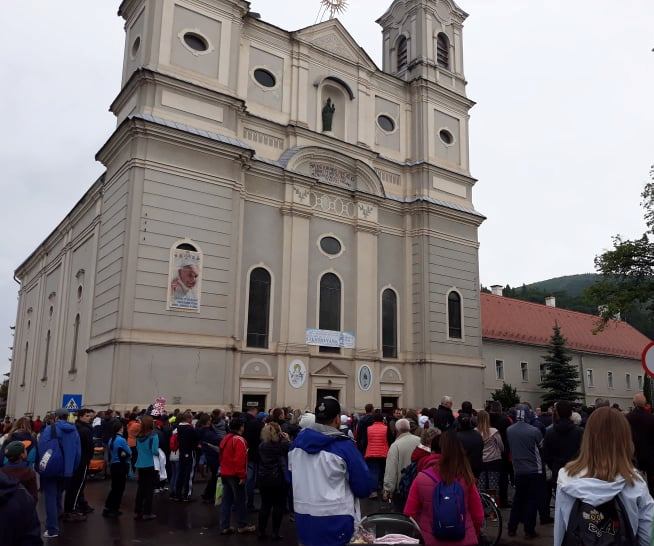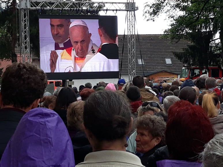 Az eső és a sár miatt a hosszú úton sokan döntöttek úgy, hogy nem mennek fel a nyeregbe, hanem a Csíksomlyói Kegytemplom udvarán, kivetítőn követik majd a szertartást. A mi csoportunkból is többen ezt a lehetőséget választották, mindez semmit sem vont le annak értékéből, hogy erdélyi és anyaországi magyarok együtt hallgathatták Mária-kegyhelyünkön a pápa számunkra megfogalmazott üzenetét.