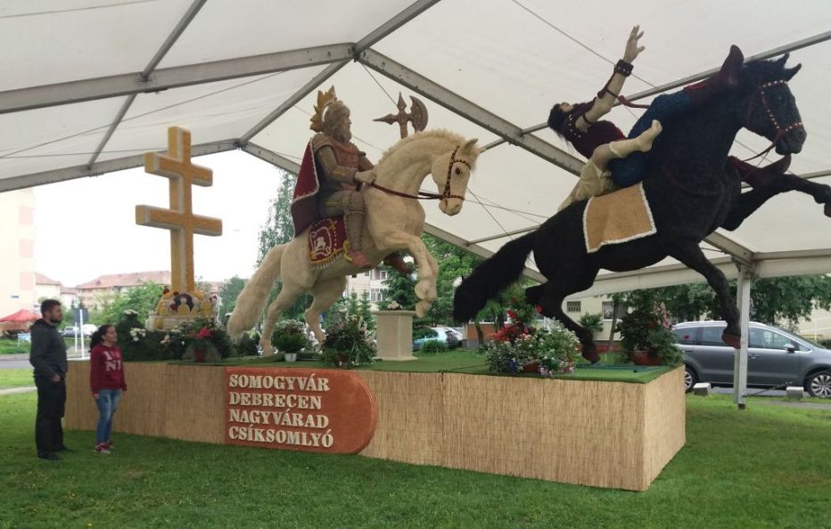A Milleniumi templom előtti téren kiállított Szent Korona virágkocsit és a Szent László Lovagkirály ereklyéjét kísérő virágkocsit egészen június 10-ig lehet megtekinteni. A különleges, több százezer virágból készült kompozíció egy több mint 900 évvel ezelőtti eseményt idéz fel, a Cserhalmi csata ütközetét, I. László király harcát a kun vitézzel. A szerte Európában ismert Szent László-legenda számos templom oltárát vagy freskóját díszíti az egész Kárpát-medencében. A Szent László és a kun vitéz csatája ? egy értelmezés szerint ? az apostol király hősies küzdelmére utal a keresztény Európa védelmében, ? más olvasat alapján ? egy ősi mítoszt, az emberi lélek saját küzdelmét, a sötétség és a világosság harcát személyesíti meg.