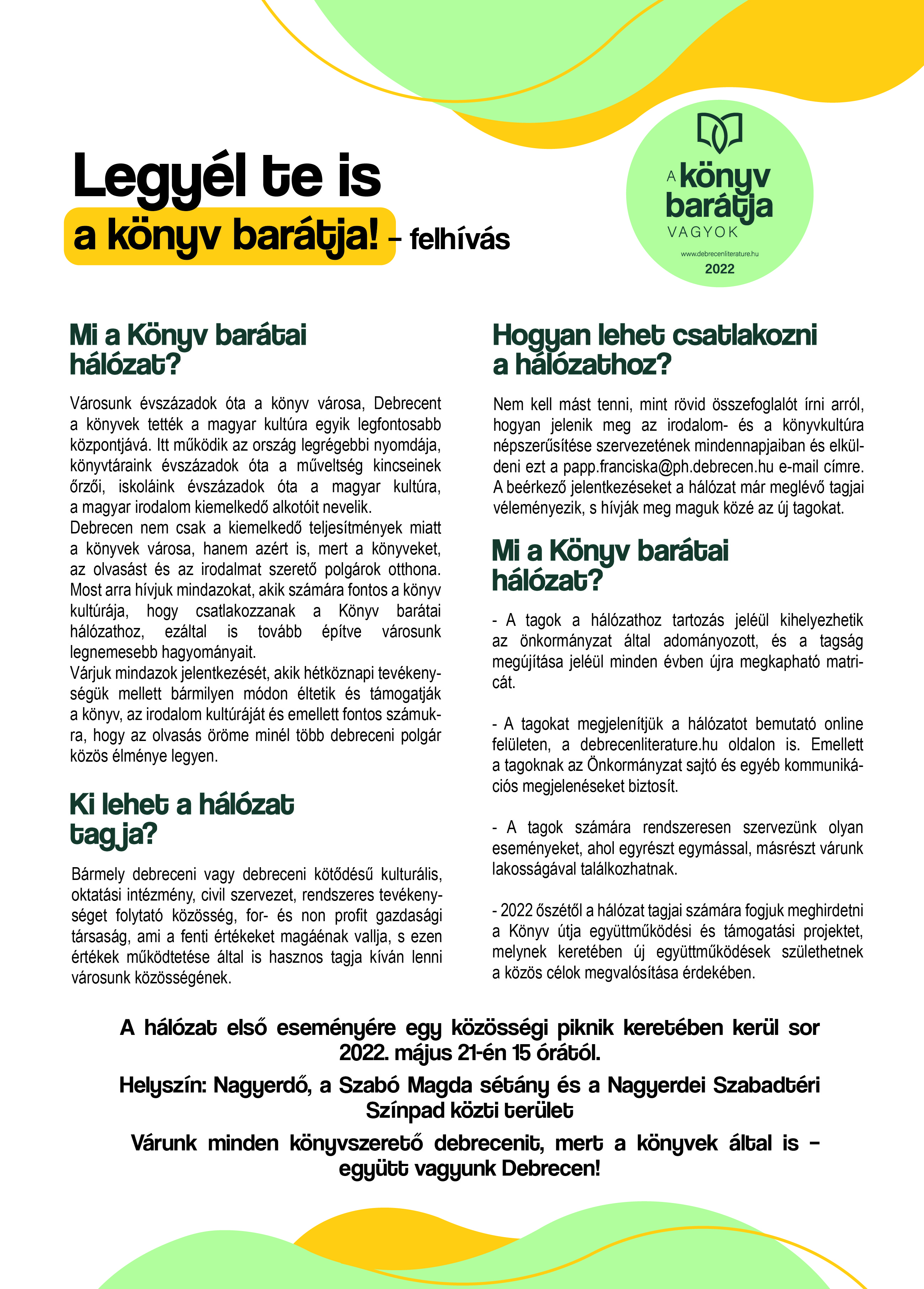 Ám Debrecen nem csak a kiemelkedő teljesítmények miatt a könyvek városa, hanem azért is, mert a könyveket, az olvasást és az irodalmat szerető polgárok otthona. Épp ezen okoknál fogva pályáztunk tavaly az UNESCO Irodalom városa címre. ? Habár a címet nem nyertük el, de összejött a városban egy olyan kreatív csapat, civilek, kulturális és oktatási intézmények, vállalkozások, művészek, akikkel nagyon sokat gondolkoztunk arról, hogy hol van a helye Debrecenben a könyv, az irodalom és az olvasás kultúrájának. Átnéztük a város hagyományait, a jelenét és gondolkodtunk azon, hogy mi lehet a jövője a város kultúrájában az irodalomnak és az olvasásnak. Ezen közös gondolkodás keretében fogalmazódott meg annak a hálózatnak az igénye, amit a mai nappal tudunk elindítani ? fogalmazott az alpolgármester. Mint mondta, a kezdeményezés azokat a debreceni közösségeket fogja össze egy platformban, akik a tevékenységük keretein belül bármilyen módon megjelenítik ezt a városunk számára közös értéket, ami a könyv, az irodalom, és az olvasás hármasában fogható össze.