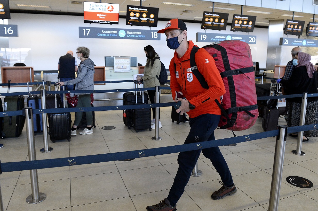 Kép: Varga Csaba, a Kalifa Alpin Csapat erdélyi magyar hegymászója a Liszt Ferenc-repülőtéren 2021. április 8-án, mielőtt elindult Nepálba, hogy megmássza a Mount Everestet "tiszta", vagyis pótlólagos oxigén nélkül. MTI/Soós Lajos