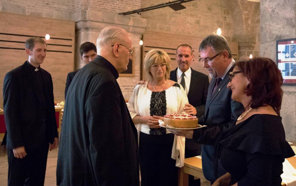 A virágkarnevál küldöttsége Debrecen Város tortájával köszöntötte az érseket.