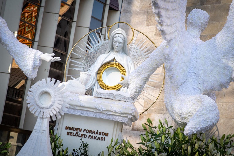 Az Eucharisztia tulajdonképpen Jézus valóságos Teste és valóságos Vére a kenyér és a bor színe alatt, az évek során számos csoda kötődik az Eucharisztiához, az egyik legismertebb a magyarországi Bátán történt, amikor egy átváltoztatott ostya vérezni kezdett. Ezen a virágkompozíción ez próbál megelevenedni: fontos az, hogy egy világméretű találkozót a Szent István által Mária oltalmába ajánlott országban rendeztek meg. Mária életének pedig a középpontjában az Isten volt, ezt szimbolizálja az Eucharisztia, amelynek piros színe a bátai csodára emlékeztet. (Tervező és szobrász: Pikó Sándor és Nádasdi Róbert, virágdizájn: Szabó Erzsébet, statikus: Kiss Péter)