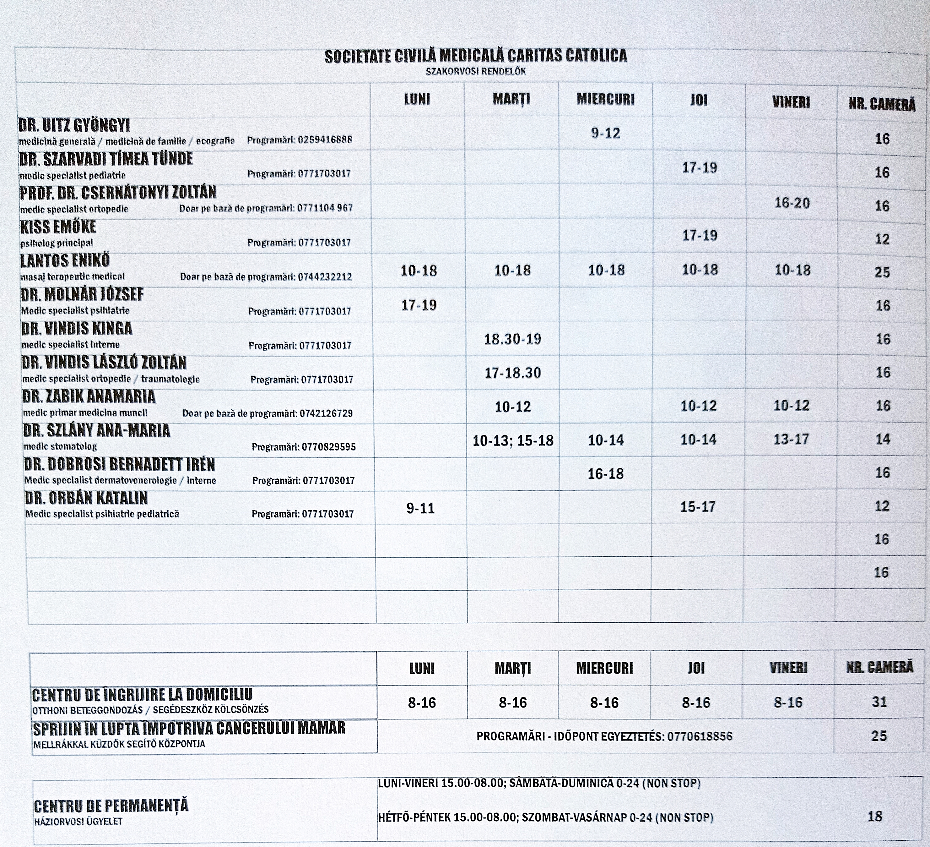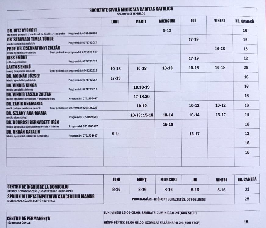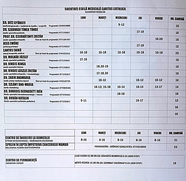 A Balassi (Ion Creangă) tér 2. szám alatt működő új részleg kizárólag előzetes időpont-egyeztetéssel igénybe vehető szakorvosi konzultációkat nyújt az alábbi szakterületeken: általános- és háziorvosi konzultáció, pszichiátria, gyermekgyógyászat, munkaügy, ortopédia, fogászat, gyógymasszázs. Információk és időpont egyeztetés a 077/170-3017-es telefonszámon (hétköznaponként 9?12 óra között). Az orvosok órarendje megtekinthető a Caritas Catolica weboldalán is. A jövedelem nélküli és kisjövedelmű páciensek ingyenes konzultációt igényelhetnek a Caritas vezetőségének címzett kérvény révén.