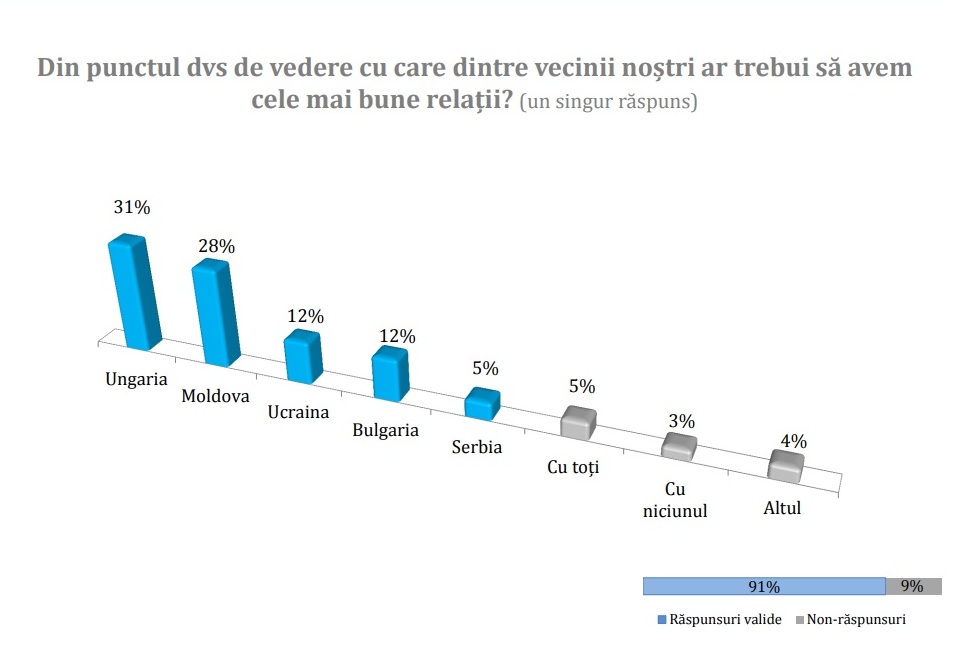 Az Avantgarde-felmérésben részt vevők közül a legtöbben, - 31 százalék - vélik úgy, hogy a szomszédos országok közül Romániának Magyarországgal kellene fenntartania a legjobb viszonyt, 28 százalék a Moldovai Köztársaságot jelölte meg, Ukrajna és Bulgária egyaránt 12 százalékot, Szerbia 5 százalékot kapott, a megkérdezettek 5 százaléka szerint Romániának mindenkivel jó viszonyt kell fenntartania, 3 százalék szerint pedig senkivel.