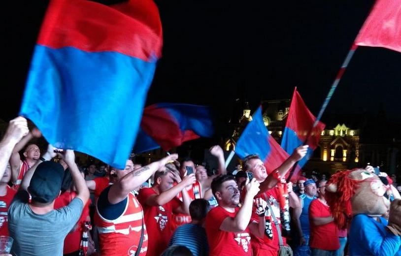 Kedd este a nagyváradi szurkolók a város központi terén, a Fekete Sas Palota előtt berendezett improvizált ?nézőtér?, óriáskivetítőjén nézték végig az első osztályú férfi kosárlabda-bajnokság Bukarestben játszott döntőjének negyedik mérkőzését, és óriási ünneplésbe kezdtek, amikor a piros-kékek, szoros küzdelemben, 92 ? 89-re megnyerték a három győzelemig tartó döntő, egyben a bajnoki címet is jelentő, harmadik meccsét..