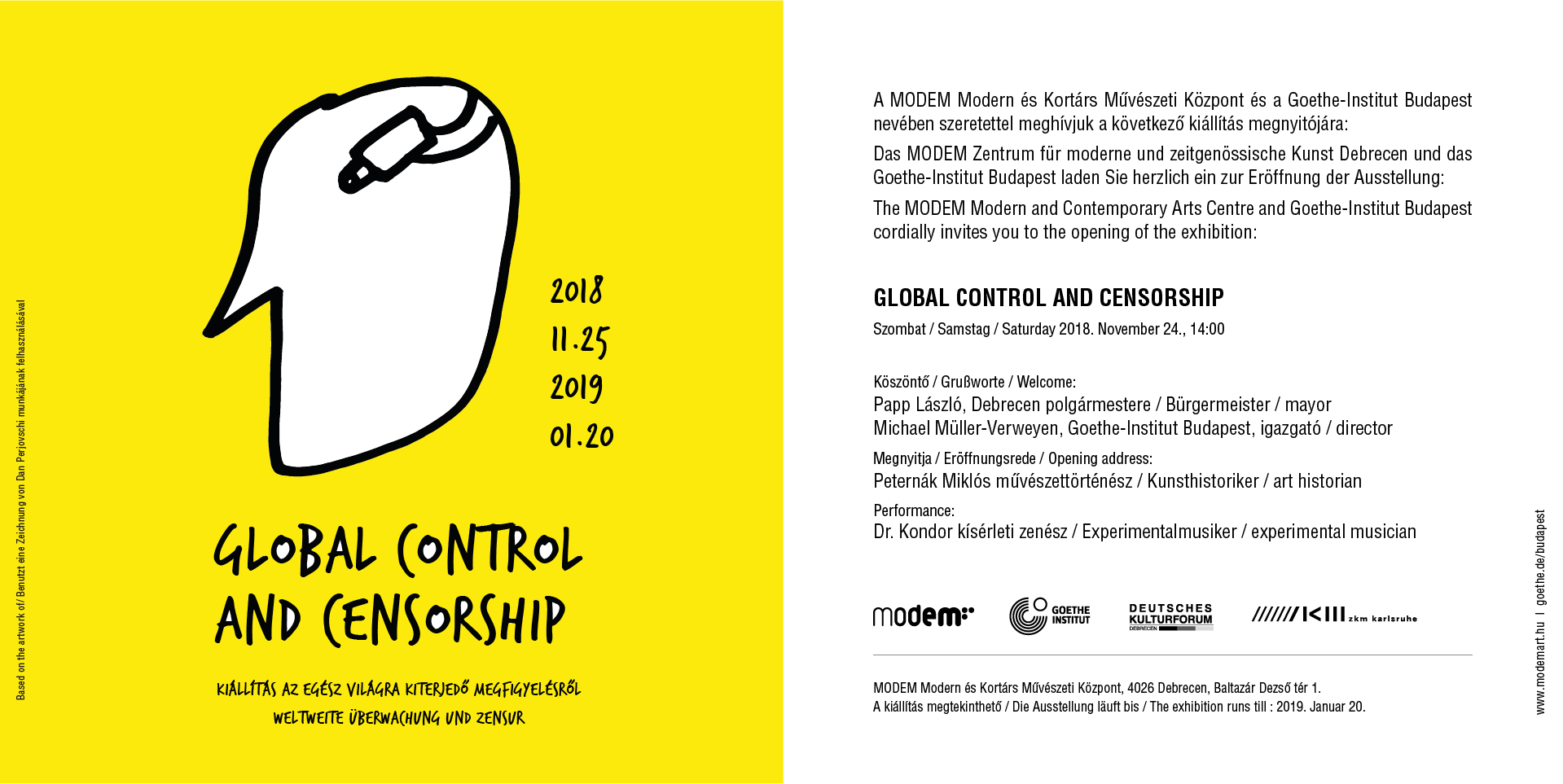 A MODEM és a Goethe Intézet bemutatja a GLOBAL CONTROL AND CENSORSHIP című kiállítását, ami először a ZKM | Karlsruheben volt látható. Az Európa több városát megjárt tárlat a megfigyelésről, az ebből fakadó félelmekről és annak hatásairól szól.