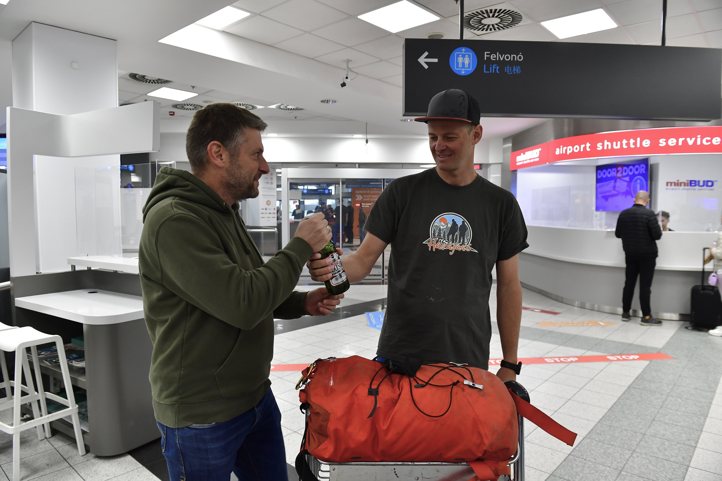 Kiemelt kép: Moys Zoltán, a Hazajáró turisztikai magazinműsor producere (b) fogadja és Csíki Sört ad ajándékba a hazaérkező Varga Csaba nagyváradi hegymászónak a Liszt Ferenc-repülőtéren 2021. október 6-án. Varga Csaba magyar idő szerint október 1-jén reggel 6-kor hódította meg Nepálban a 8167 méter magas Dhaulagirit, ezzel a legtöbb nyolcezres hegycsúcsot - pótlólagos oxigén és magashegyi teherhordók segítsége nélkül - elérő élő magyar hegymászóvá lépett elő. MTI/Koszticsák Szilárd