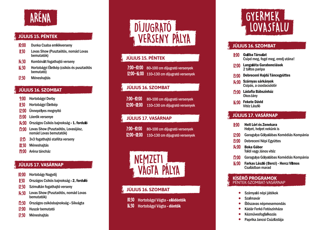 Az országos és nemzetközi díjugrató verseny mellett csikós bajnokságot is tartanak, szombaton pedig startol a Hortobágyi Vágta, a Nemzeti Vágta regionális selejtező futama, amelynek győztesei indulhatnak az őszi budapesti megmérettetésen.