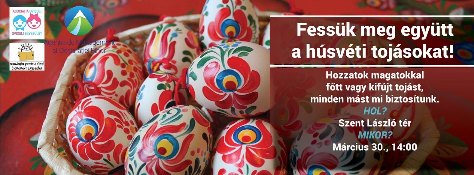 Az Ovisuli Egyesület és a Diákokért Egyesület partnerségben a Bihar megyei Turisztikai Desztináció Menedzsment Ügynökséggel, március 30-án, pénteken 14 órától idén először a Szent László téren szervezett húsvéti vásár keretein belül, húsvéti tojásfestésre hívja meg az érdeklődő gyermekeket, szülőket, nagyszülőket, hogy együtt készülhessenek fel a feltámadás ünnepére. A foglalkozást Perecz Simó Annamária és Vass Anna tanító néni fogja tartani. Minden gyermeket kérnek, hogy vigyen magával főtt vagy kifújt tojást, a többi eszközt a szervezők biztosítják. Az első öt jelentkezőt meglepetéssel várják!