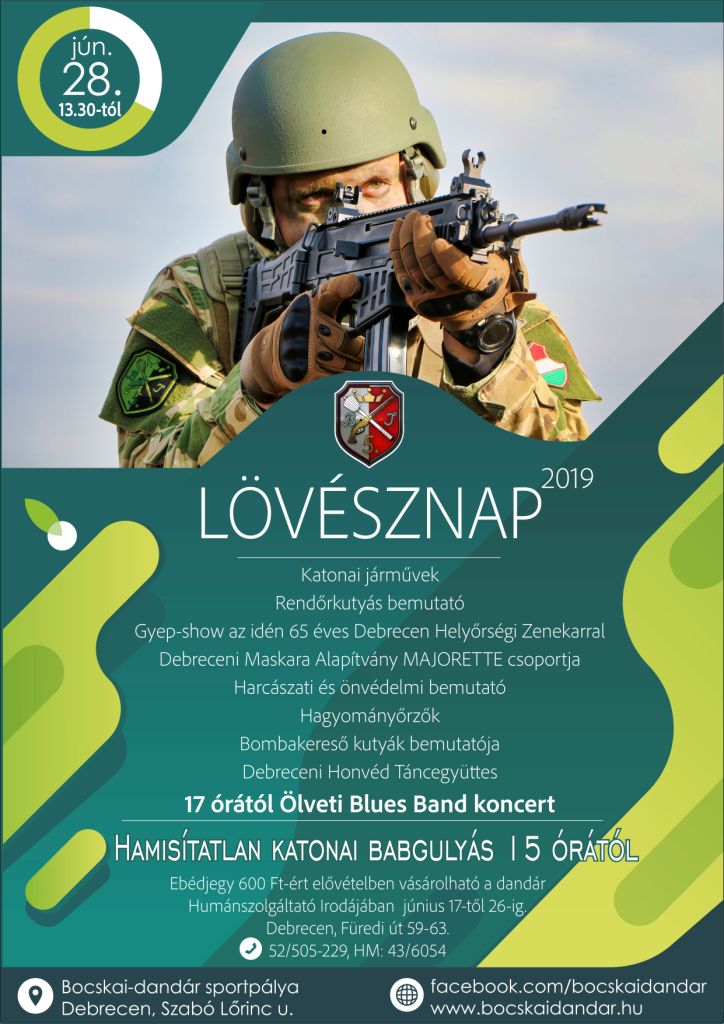 A katonai járművek, felszerelések és a katonazenekar természetesen idén sem hiányozhat. A számos program mellett hagyományőrzők és a bocskais katonák is tartanak majd bemutatókat. Aki kilátogat a rendezvényre, az igazi katonai babgulyást is megkóstolhatja, amelyhez elővételben vásárolható jegy a dandár Humánszolgáltató Irodájában (Füredi út 59-63.). A programok zárásaként pedig az Ölveti Blues Band koncertjét hallgathatják meg az érdeklődők. A rendezvény ingyenes! Minden érdeklődőt várnak a katonák június 28-án pénteken 13.30-tól a dandár sportpályáján, Debrecenben, a Szabó Lőrinc utcán!