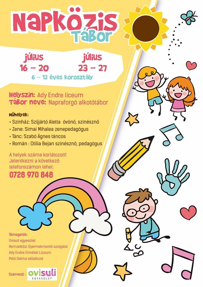 A két napközis Napraforgó Alkotótábor, melyet ötödik éve szerveznek meg, szintén két turnusban várja a gyerekeket a nagyváradi Ady Líceumban, és 6-12 évesek számára szól. Az első turnus július 16-20, a második pedig július 23-27. között lesz. A műhelyprogramok között szerepel a színház, tánc, zene, illetve a román nyelv játékos oktatása. A színházi programokat Szíjjártó Aletta óvónő, színésznő vezeti majd, a zenével Mihaela Simai zenepedagógus, a tánccal Szabó Ágnes táncos foglalkozik, románul pedig Otilia Bejan színésznő, pedagógus tanítja majd a gyerekeket.