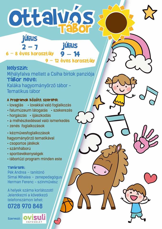 Az ottalvós, tematikus tábor, idén a Kaláka hagyományörző tábor nevet kapta. A jelentkezőket két korcsoport szerint várják majd a táborokba: 6 - 8 éves kategória - július 2 ? 7, illetve 9 - 12 éves kategória - július 9 ? 14.