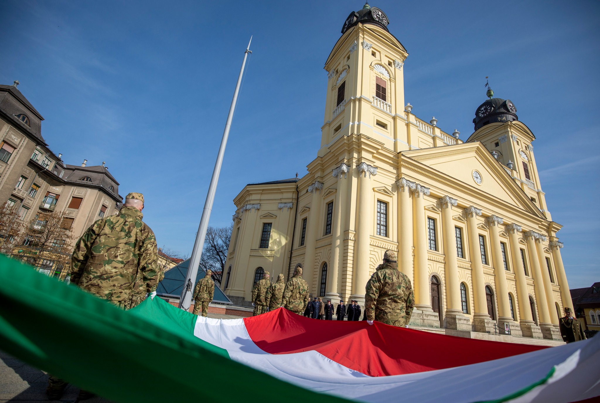 Katonai tiszteletadás mellett, az országzászló felvonásával kezdődött a március 15-i ünnepségsorozat kedden Debrecenben. Az 1848/49-es forradalom és szabadságharc 174. évfordulóján, a Petőfi téren található, a költőt megformáló szobor koszorúzását követően a résztvevők a Debreceni Helyőrségi Zenekar vezetésével a Kossuth térre masíroztak, ahol ünnepi beszéddel, illetve a Kossuth-szobor megkoszorúzásával folytatódott az ünnepség.