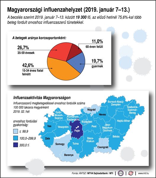 A magyarországi Nemzeti Népegészségügyi Központ adatai szerint, az ország valamennyi közigazgatási területén emelkedett az influenzás panaszokkal orvoshoz fordulók gyakorisága az előző héthez viszonyítva, a legtöbb beteg Fejér megyében, Budapesten, Pest és Somogy megyében volt. Az előző héthez viszonyítva az influenza miatt orvoshoz fordulók gyakorisága Borsod-Abaúj-Zemplén és Csongrád megyében több mint háromszorosára nőtt.