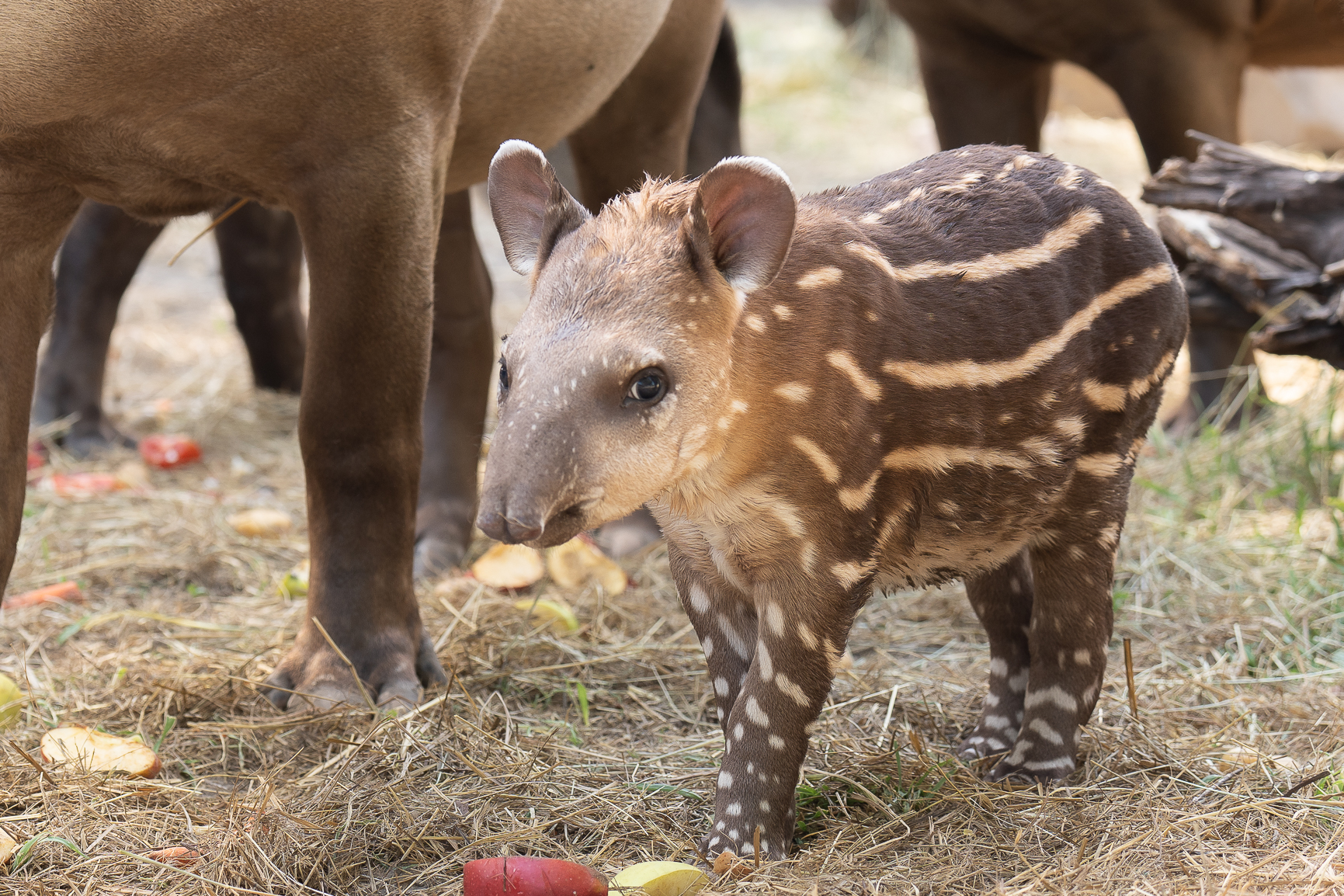 A születésekor 6,2 kg-os, Zsaklin névre keresztelt apróság egyelőre szorosan követi tapasztalt és gondoskodó anyját, de már rendszeresen megfordul a Dél-Amerika kifutósoron is, ahol legnagyobb eséllyel a tapírok 10:15-kor kezdődő napi látványetetésén találkozhatunk vele. Étvágya kitűnő, és egyre nagyobb kíváncsisággal ismerkedik a felnőttek táplálékával. A faj utódaira jellemző csíkos és pöttyös rejtőszínezetét nagyjából féléves koráig őrzi majd meg.