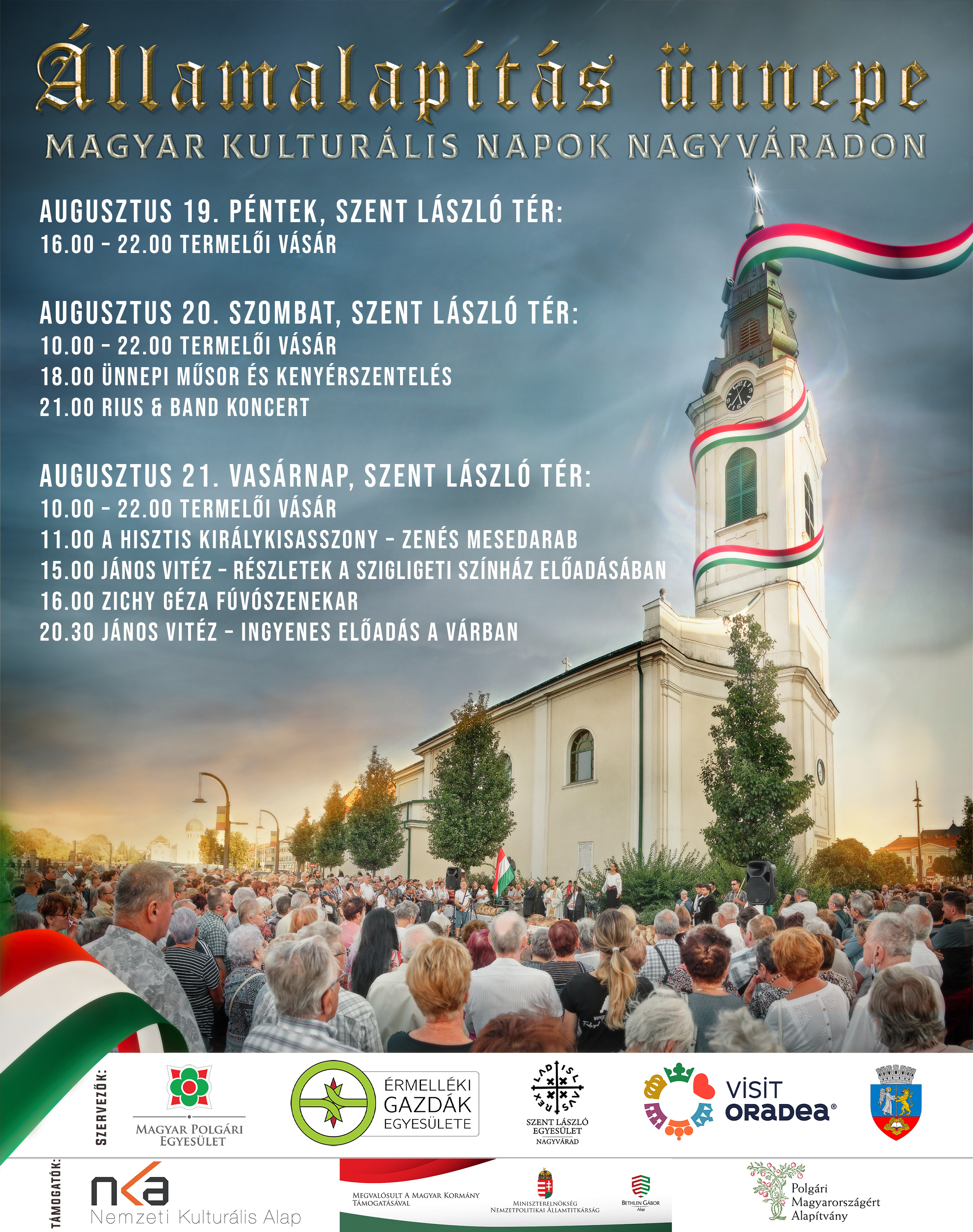 Hagyományos kenyérszenteléssel, kézműves termékek vásárával, Szent Istvánról szóló énekekkel, komoly- és könnyűzenei koncertekkel, néptánc előadásokkal és gyermekprogramokkal várják a nagyváradiakat Szent István napján, a magyar államalapítás, és az új kenyér ünnepén, azaz augusztus 20-án, a Szent László téren. Nagyvárad ebben az évben is, augusztus 21-én, ünnepélyes keretek között fogadja a Debreceni Virágkarnevál allegorikus virágkocsijait.